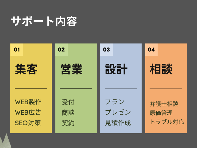 私たちはそのような高額投資をしなくても、集客から営業・設計・相談まで、元請けに必要な仕組みをワンストップで低コスト提供。